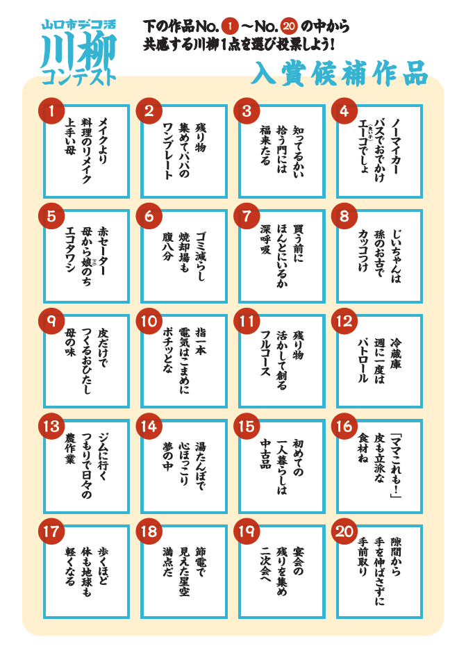 応募総数224点から選ばれた秀作20点のうち、共感する川柳1点を選んで下記ウェブサイトからご投票ください。